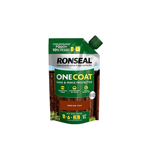 Give your exterior wood surfaces a fresh, stunning look with the Ronseal One Coat Refill Medium Oak Matt Exterior Shed & Fence Protector Wood Paint. This high-quality paint is designed to penetrate deep into the wood to provide long-lasting protection against weathering and damage.
